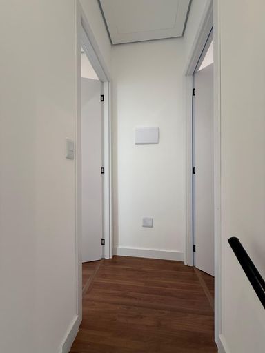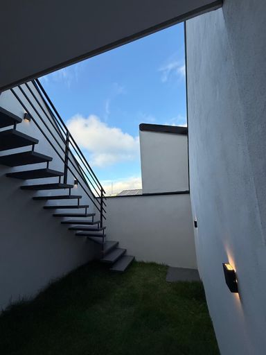 - Sala ampla: guarda corpo da escada em ripado, acabamento em porcelanato;
