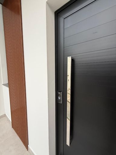 Para completar uma fachada moderna com painel ripado em alumínio e 2 vagas de garagem.